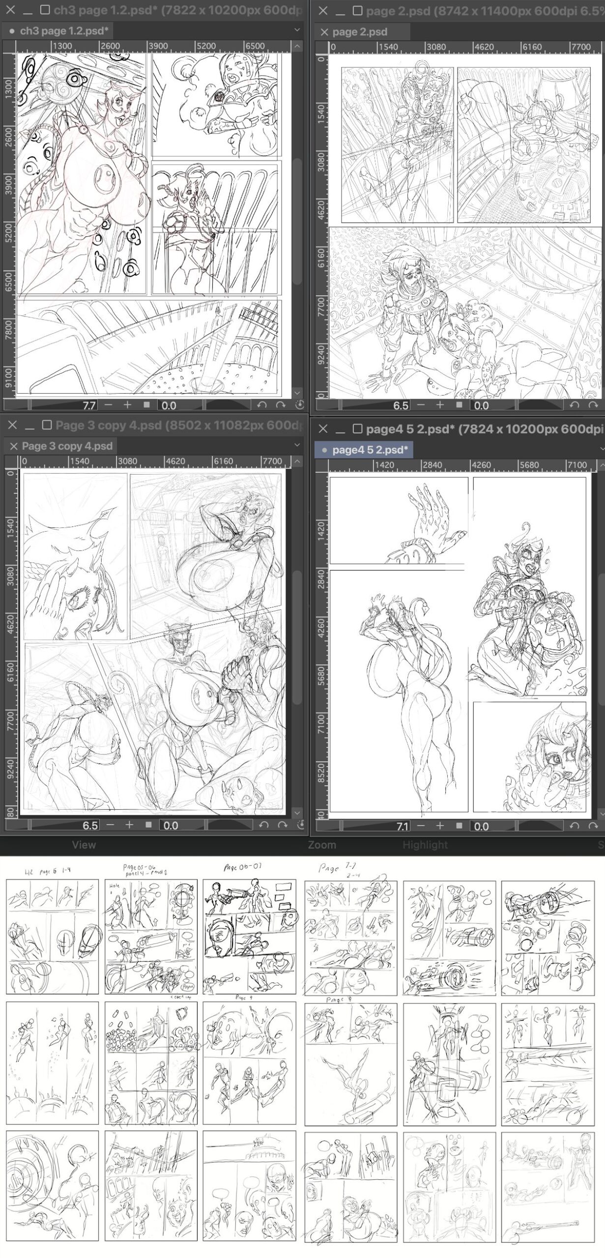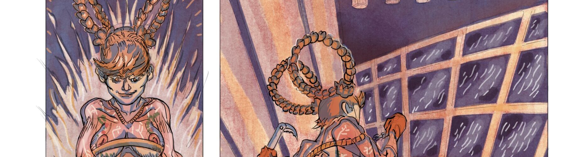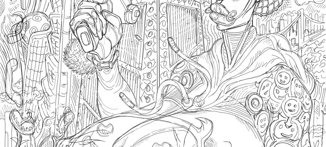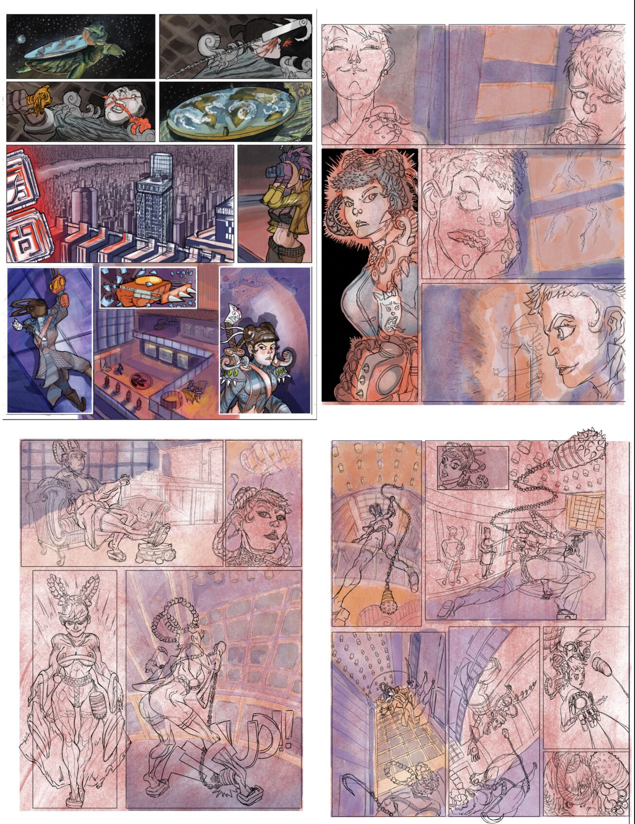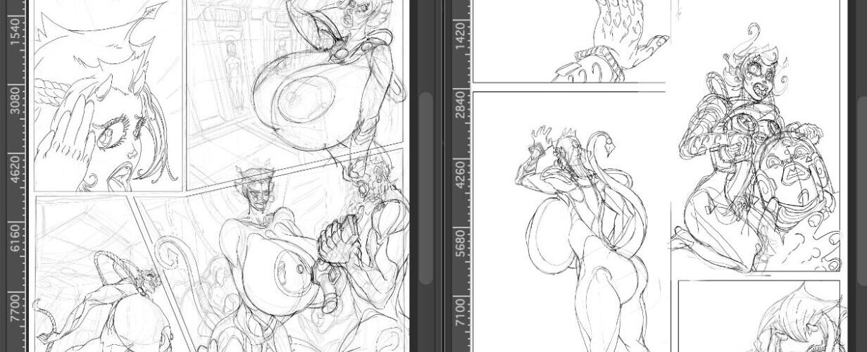 These are the pages so far. The inks have been completed; now it’s time for color. The first four pages have been made smaller and grouped together so I can achieve shadow and color consistency. Basically, it’s about spotting the blacks. I also created a separate texture layer underneath the […]