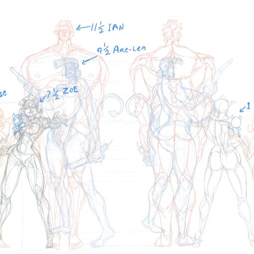 This is a chart showing the size relationships between Hybrid Zero characters. Are-lea’s head is the basic unit of measurement. For instance, Zoe, her daughter, is 7 and a half Are-lea heads tall.